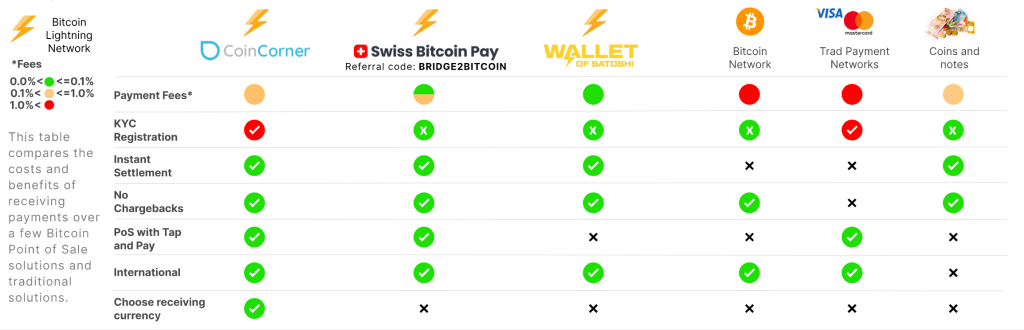 The charts below shows the costs and benefits of receiving payments via the Bitcoin Lightning Network or the Boltcard.